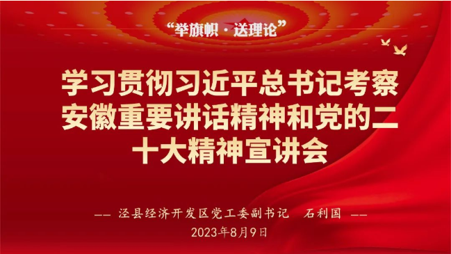 8月9日,涇縣經濟開發區黨工委副書記石利國走進安徽江南泵閥集團有限公司,開展“舉旗幟 送理論”學習貫徹習近平總書記考察安徽重要講話精神和黨的二十大精神宣講會。