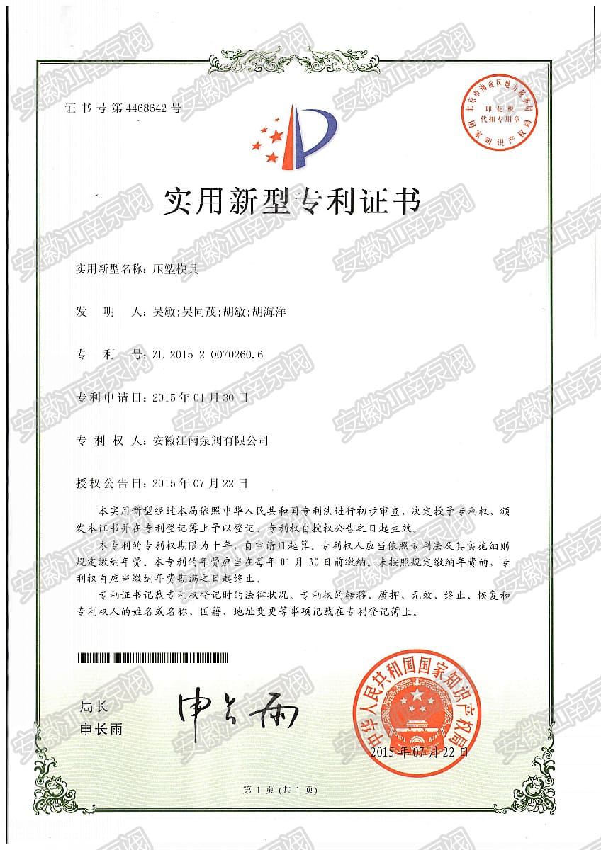 安徽江南泵閥有限公司榮獲超高分子量聚乙烯壓塑模具專利,主營:氟塑料泵,不銹鋼泵,耐腐蝕化工泵,品質(zhì)卓越,行業(yè)領(lǐng)跑企業(yè),科研生產(chǎn)型企業(yè)20年鑄就行業(yè)輝煌!...