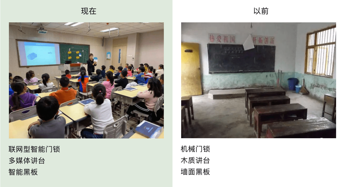 在時代的推動下,校園開始更新換代,從教室的第一道防護門開始,從內到外都發生了變化,木門上安裝了聯網型智能門鎖,保護學生安全,便捷課堂,黑板采取多媒體設備,顏色更直觀,畫面更生動,老師上課能夠運用多種教學方法,使學生上課更專心。