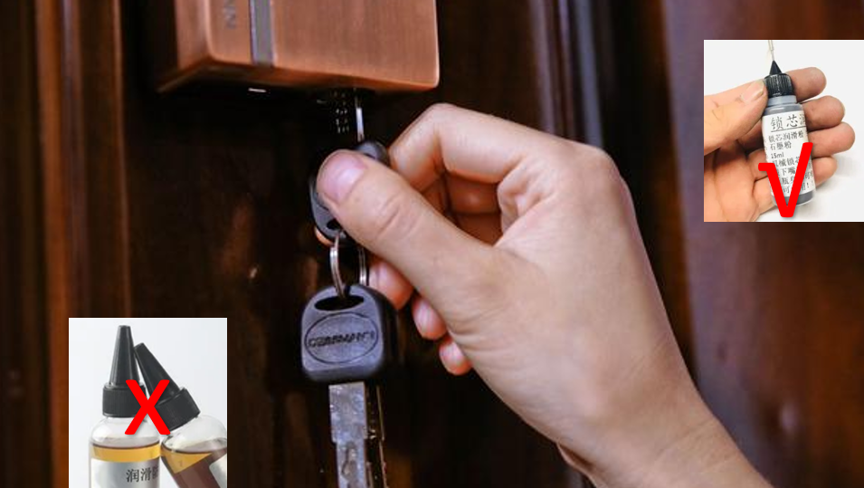 鑰匙插進機械鎖孔里面,轉不動,打不開。很多人選擇用潤滑油去解決,錯了!!!不少人都常規地認為機械部分潤滑當然是要交給潤滑油了。實際上并非如此。潤滑油不能亂加,因為油易黏灰,很有可能導致鎖孔里慢慢積存灰塵,而形成油膩子,影響正常使用。還是建議用老方法,用墨粉或鉛筆粉,如果機械鑰匙插拔不順暢,可以在鎖芯槽內抹入少許石墨粉或鉛筆粉,以確保鑰匙正常開門。千萬不要加入其他任何油類作潤滑劑,那樣若油脂粘住彈子彈簧,鎖頭可能就不能轉動打開了。